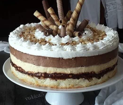 Bjelanjke umutite u čvrsti snijeg, dodajte šećer i na kraju umiješajte brašno te smjesu sipajte u kalup na lješnjake i pecite 10-ak minuta u zagrijanoj pećnici dok smjesa ne poprimi lagano smećkastu boju. Kad se biskvit ohladi, okrenite ga tako da biskvit bude dolje, zadnji red, a lješnjaci gore – drugi red i vratite u kalup za tortu i vratite obruč od kalupa da vam bude lakše slagati redove torte.