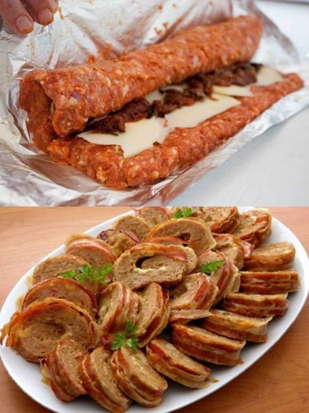 Na blizi kraj ploce poredjati stapice kackavalja ceo red i pazljivo uz pomoc folije urolati kao rolat.