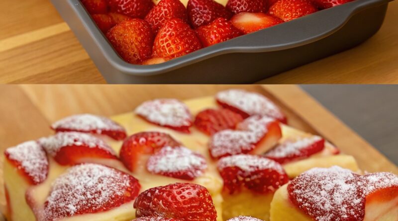 Nakon toga premjestite smjesu u lim, pazeći da je poravnata špatulom, a zatim rasporedite preostale jagode na smjesu. Lim stavite u pećnicu zagrijanu na 180 stupnjeva i ostavite da se peče oko 40 minuta, odnosno dok se torta ne odvoji od rubova i ne dobije zlatno žutu boju na površini.