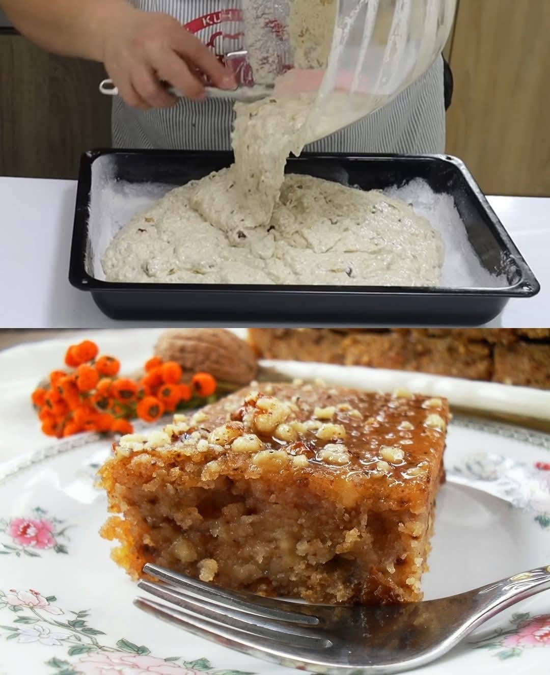 Po želji tijesto nadjenite sa 50 g sjeckanih oraha. Pecite 35-40 minuta, a je li gotovo provjerite čačkalicom. Kada je torta gotova, izvadite pleh i ostavite da se kolač ohladi dok je još u njemu.