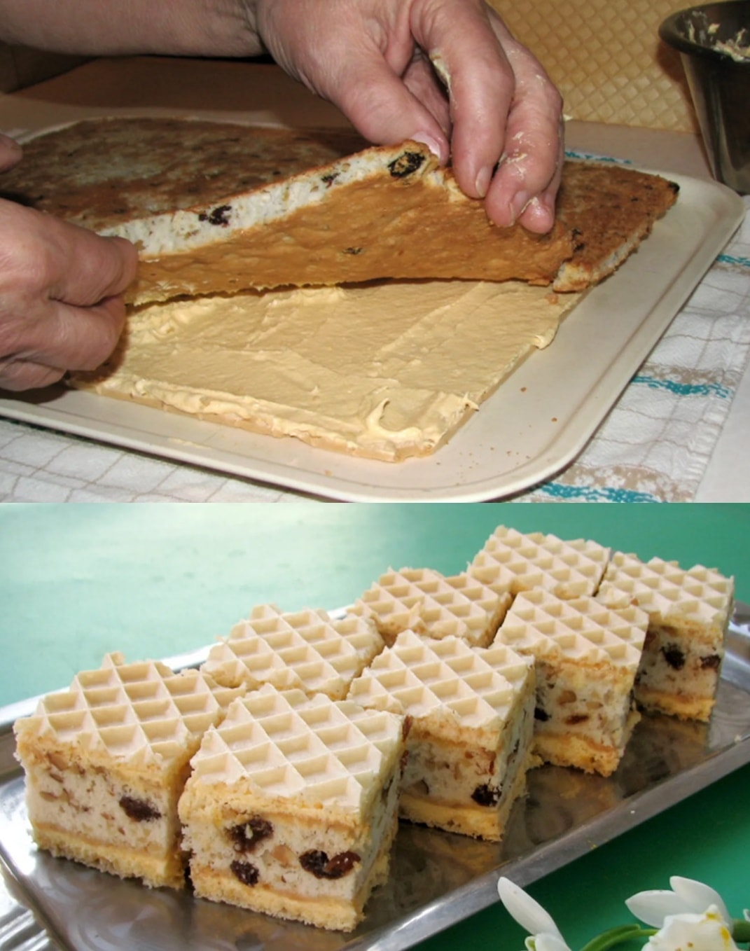 Na biskvit stavite drugu oblatnu pazeći da je glatka strana okrenuta prema dolje i stavite odgovarajući uteg da stisnete slojeve. Ostavite kolač da odstoji preko noći prije nego što ga režete na željene dijelove.