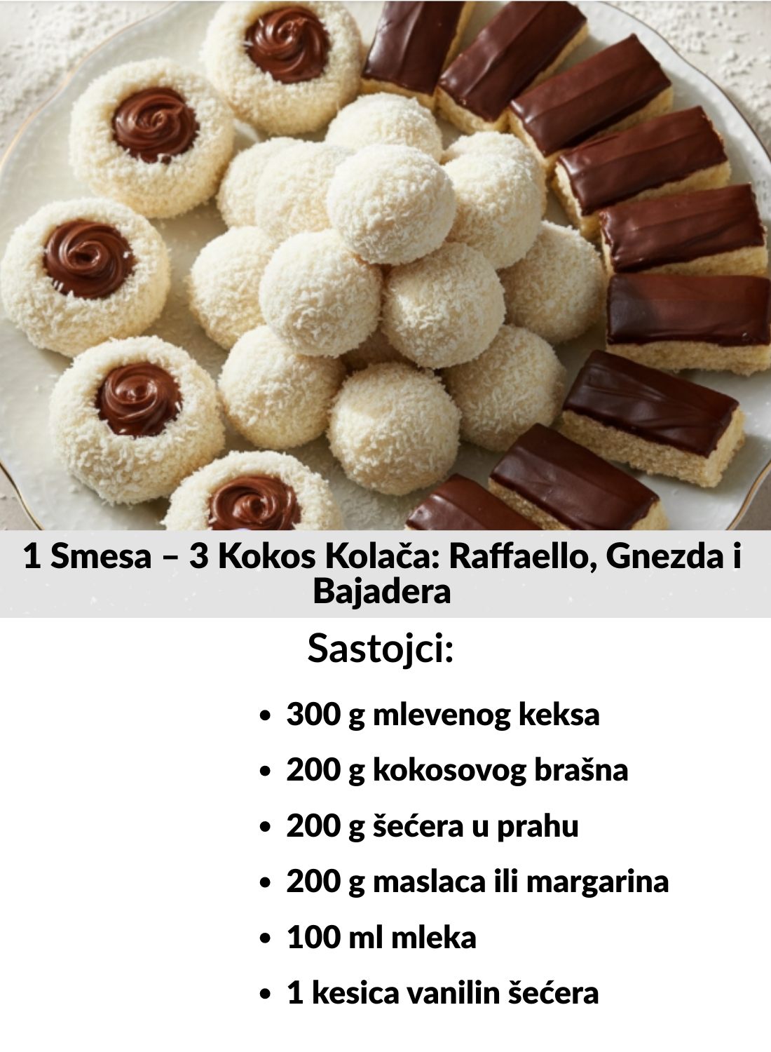 Ovaj recept je “spas u zadnji čas” jer ne zahteva pečenje (no-bake), ne sadrži jaja i priprema se za manje od 30 minuta. Od jedne baze napravićete: bele Raffaello kuglice, elegantna Kokos gnezda punjena čokoladom i ukusnu Kokos Bajaderu.