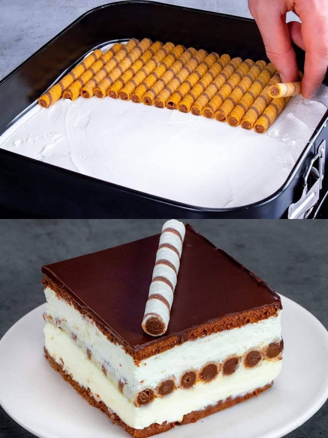 Sipajte slatku pavlaku pa sve dobro umutite. Pola fila sipajte preko keksa. Poravnajte. Poređajte čokoladne rolere pa stavite drugu polovinu fila. ponovo poravnajte i poređajte ostatak keksa. Stavite u frižider na 2h. Nakon toga skinite obruč i isecite tortu.