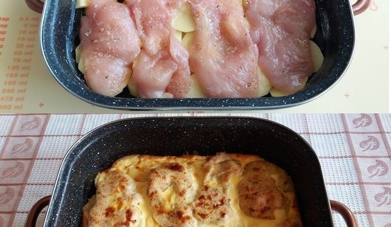 Za ovaj recept potrebno vam je 500 grama pilećeg filea, 700-800 grama krompira, suvi začini, so, biber, 2 jaja, 200 mililitara kiselog vrhnja, 50 mililitara ulja i 20 grama putera.