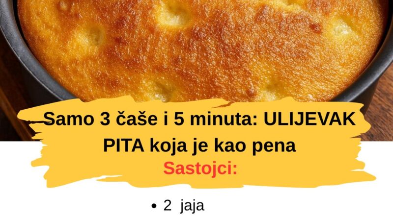 Read MoreUlijevak pita kao pjena – ovo se pravi brzinom munje. Sastojci:2 jaja3 kasike ulja1 prasak za pecivo3 pune kasike psenicnog